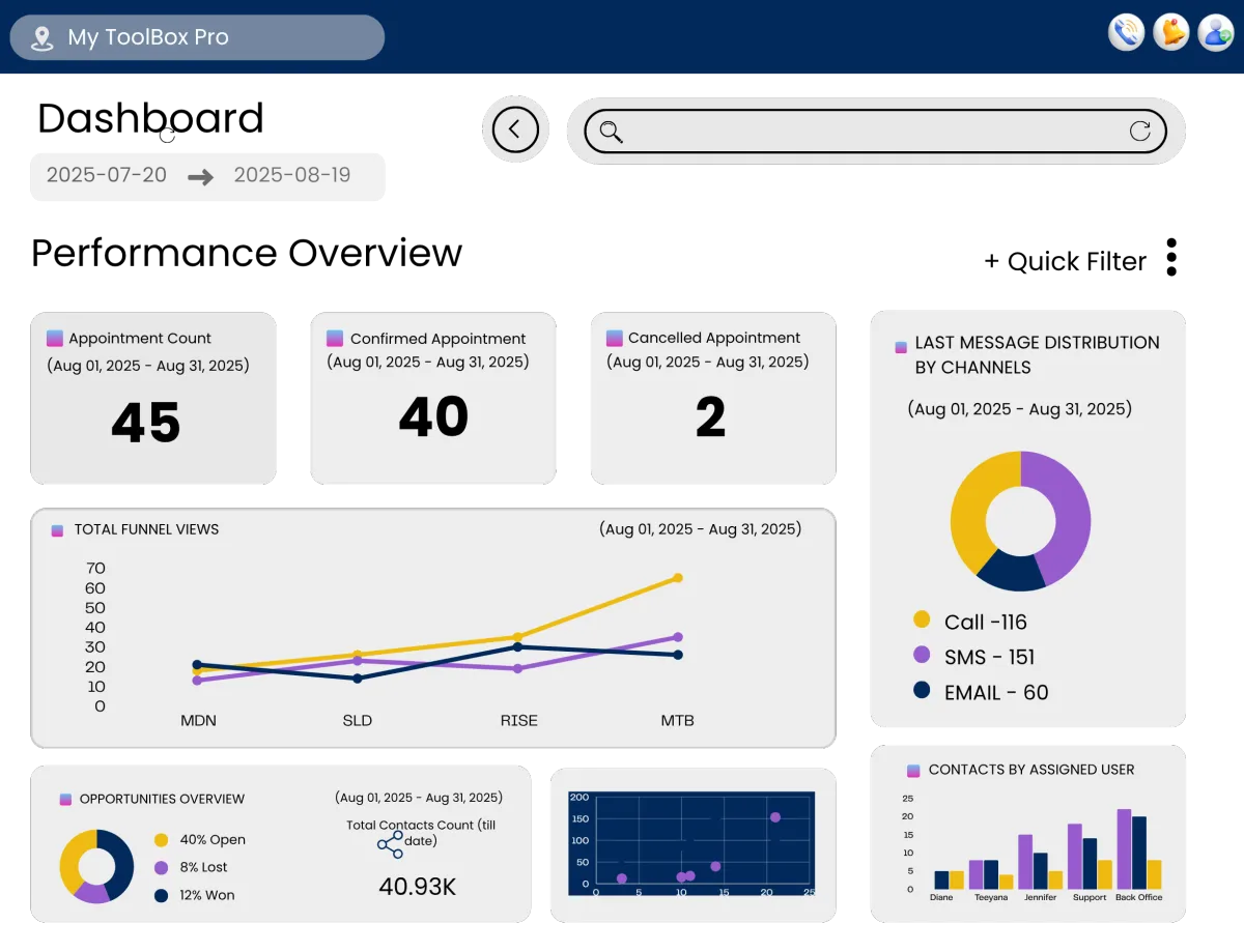 MyToolBox Pro gives you all the tools to manage leads, build websites and funnels, handle bookings, send messages, and keep your business organized—no need for extra software.